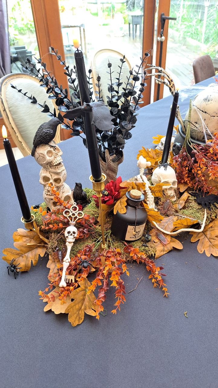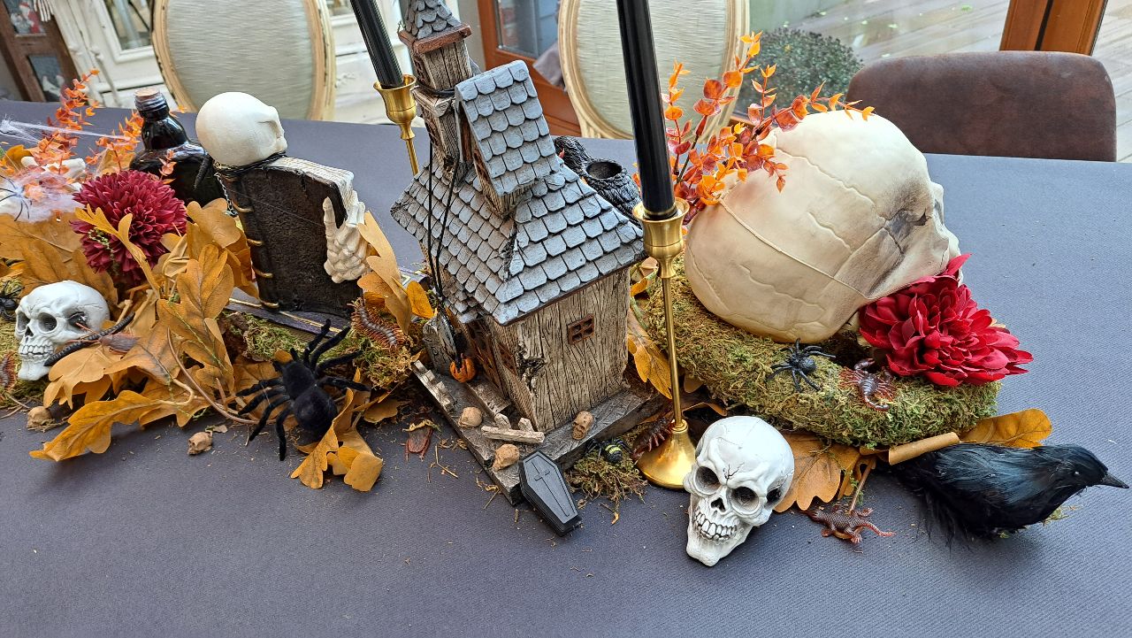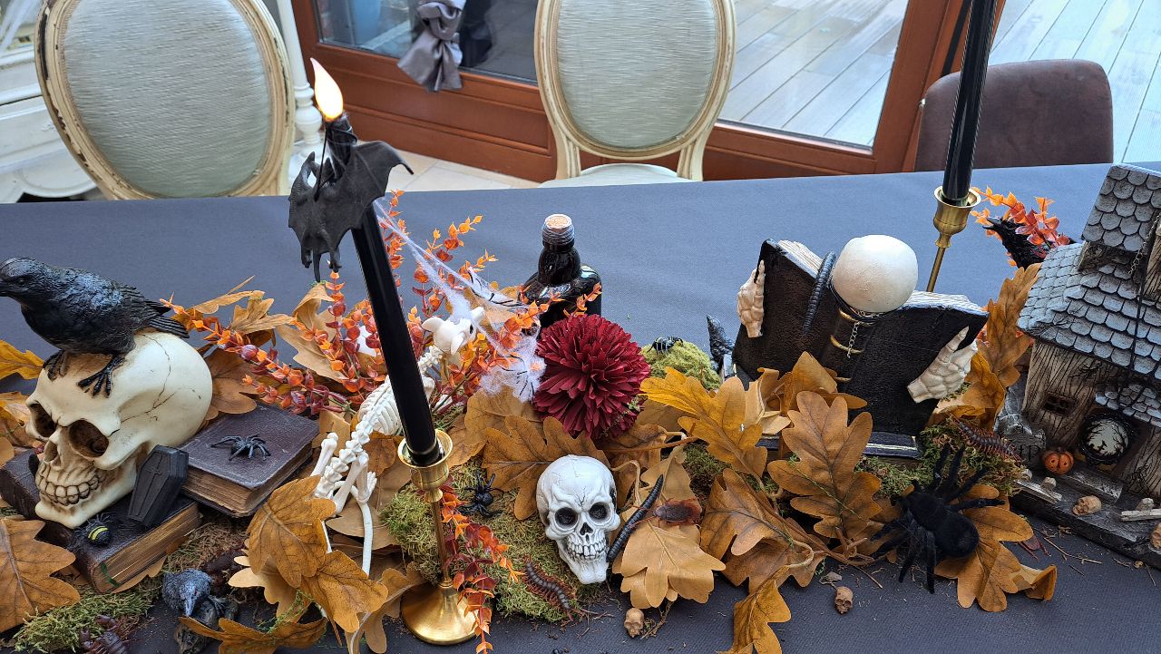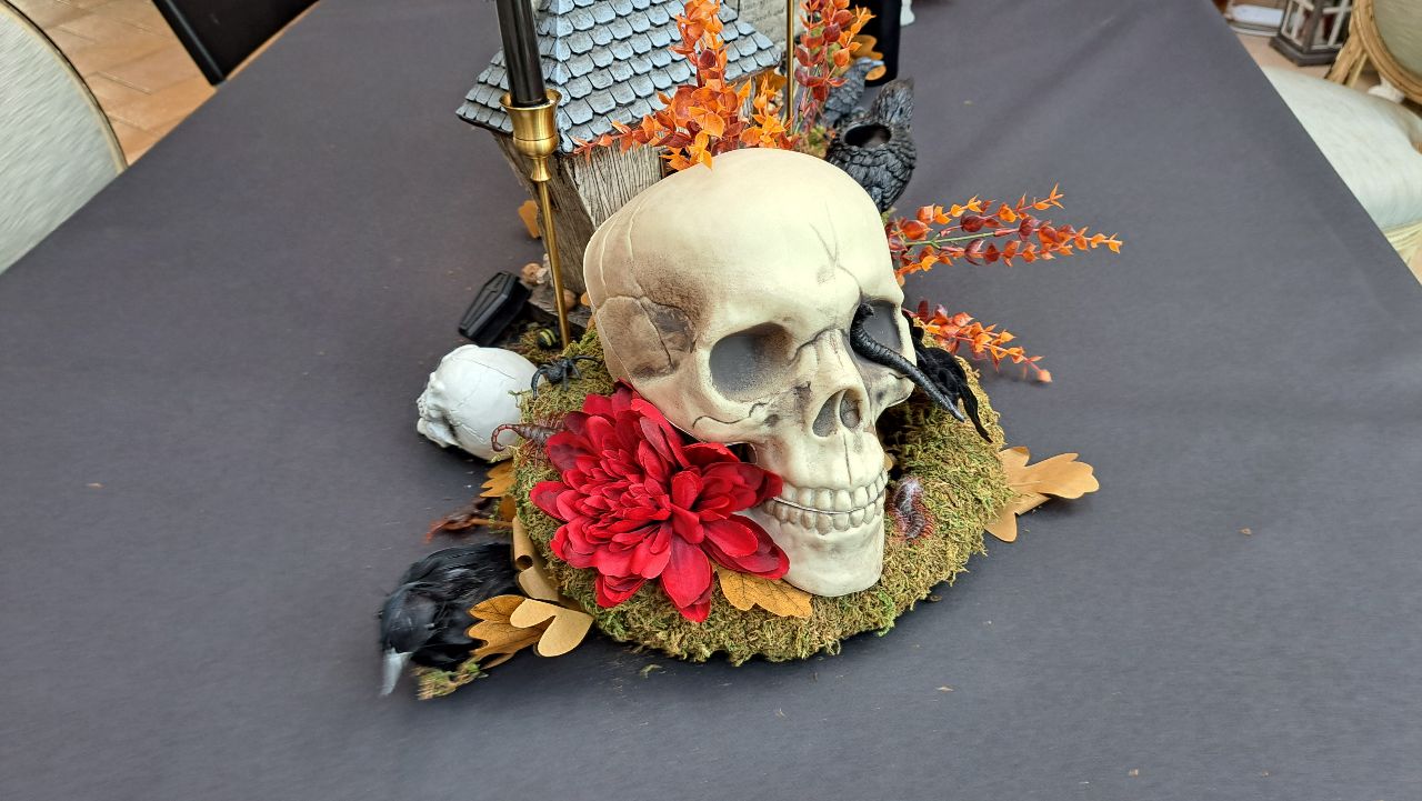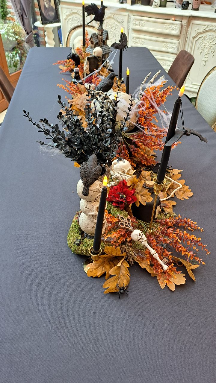 Dès le premier regard, le décor captive : un chemin de table végétal mêlant mousse, feuilles d’automne et branches sombres accueille crânes blafards, vieux grimoires, fioles d’élixirs et mains squelettiques. Le tout est ponctué de fleurs rouge sang, de toiles d’araignées suspendues et de chandeliers noirs au charme inquiétant.