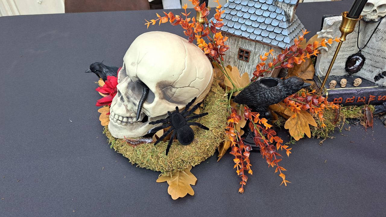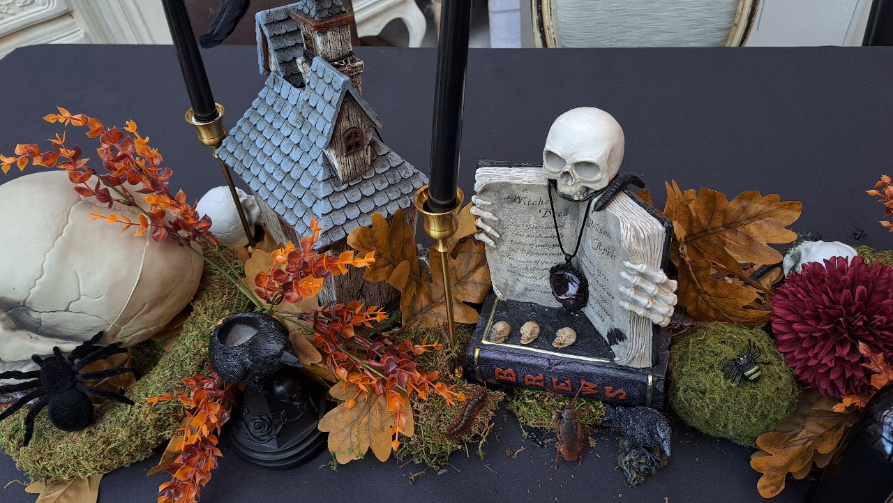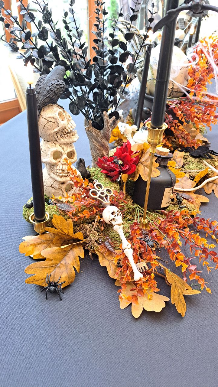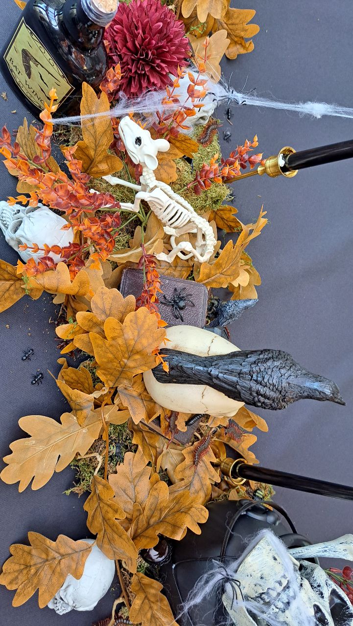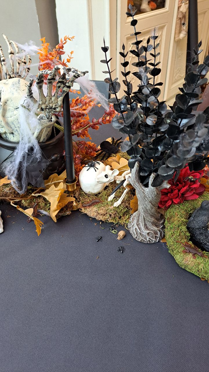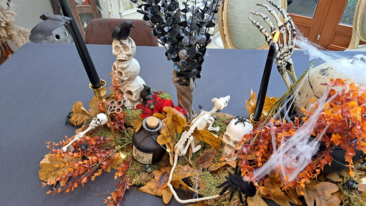 Dès le premier regard, le décor captive : un chemin de table végétal mêlant mousse, feuilles d’automne et branches sombres accueille crânes blafards, vieux grimoires, fioles d’élixirs et mains squelettiques. Le tout est ponctué de fleurs rouge sang, de toiles d’araignées suspendues et de chandeliers noirs au charme inquiétant.
