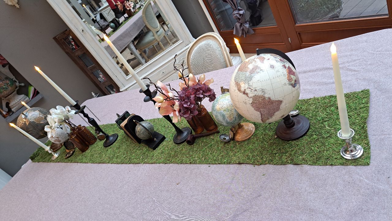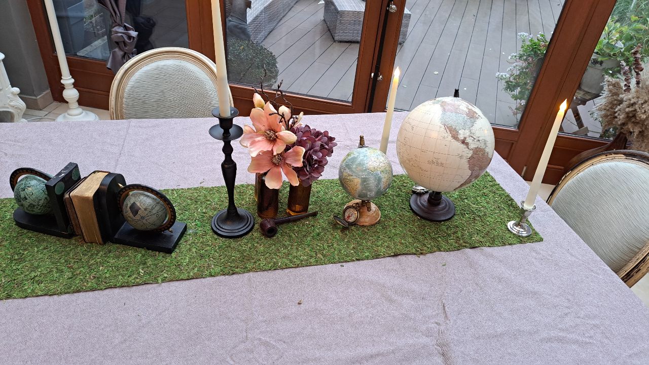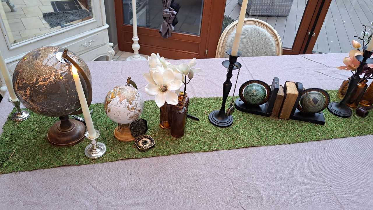 Des globes anciens aux teintes patinées, des compas rétro, des livres d’explorateurs et de délicates fleurs exotiques se côtoient avec élégance sur un chemin de table en herbe naturelle. L’ensemble évoque les grandes explorations, les récits de voyage et les objets rapportés d’ailleurs.