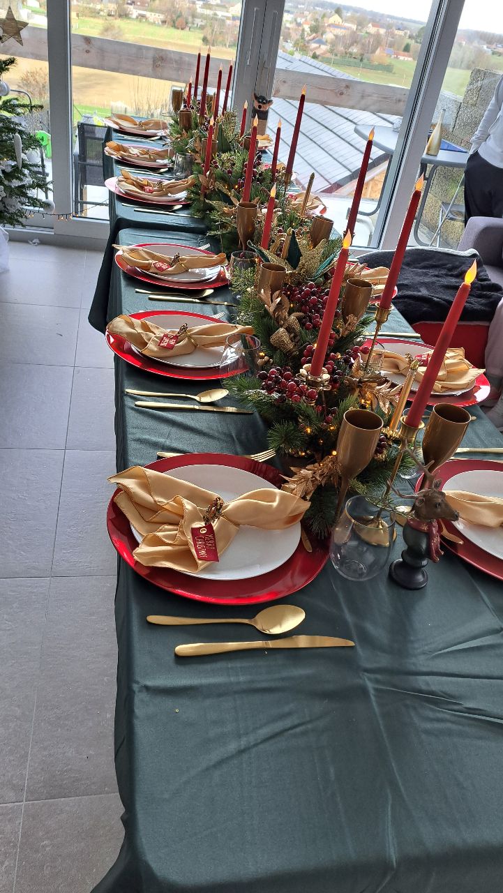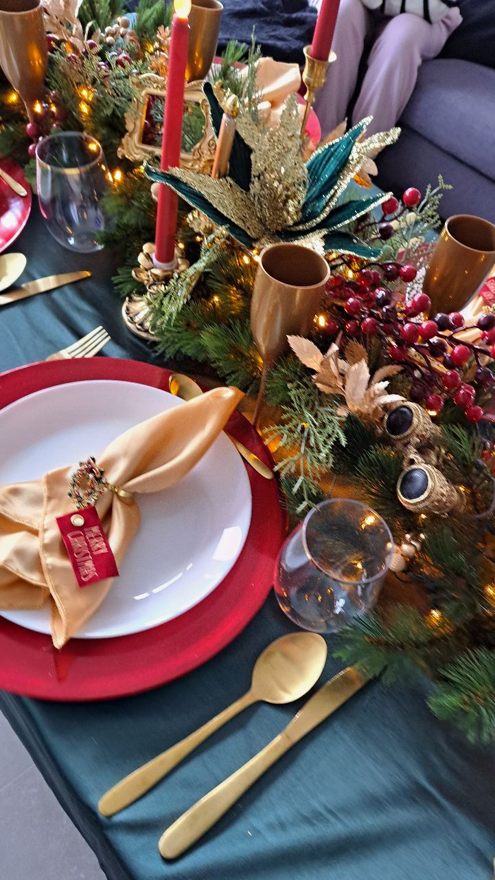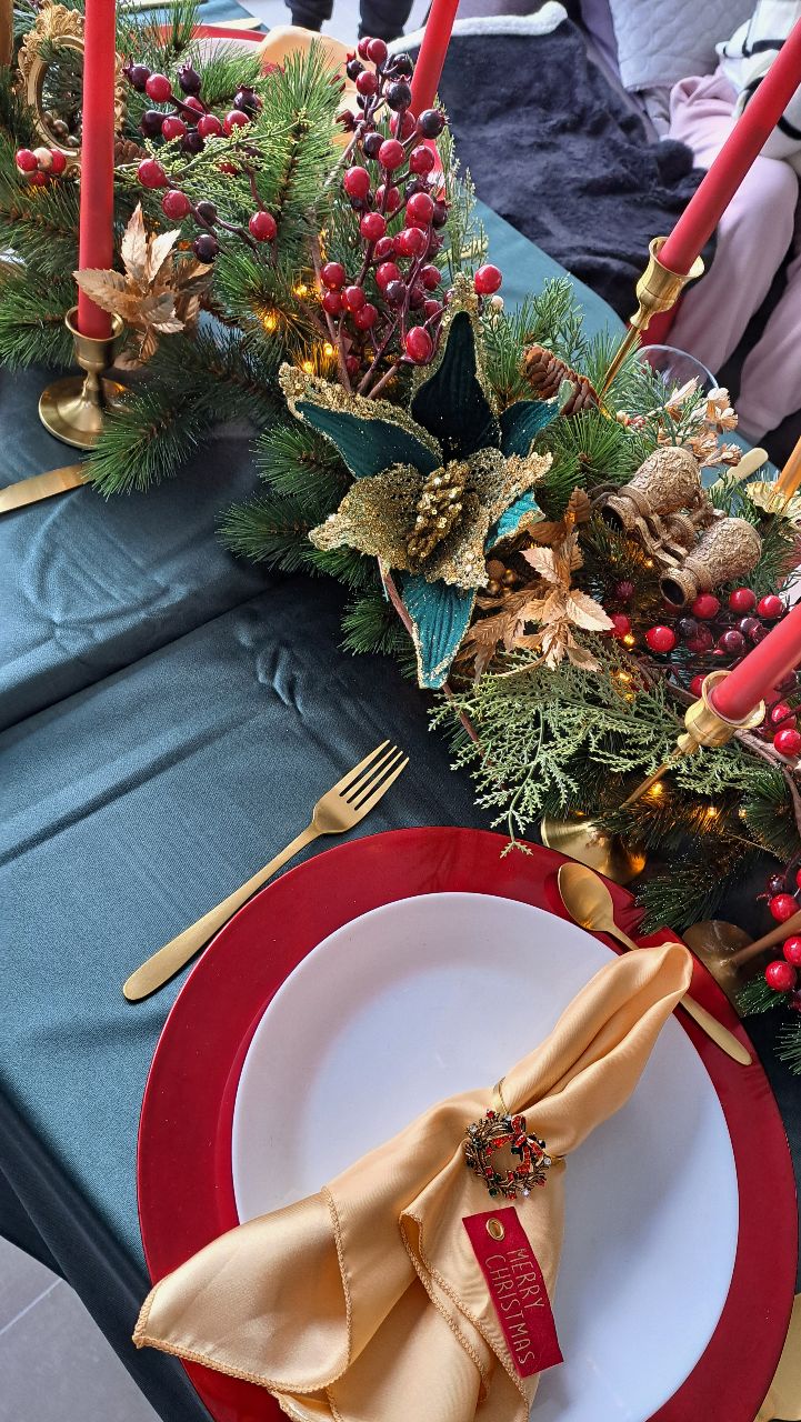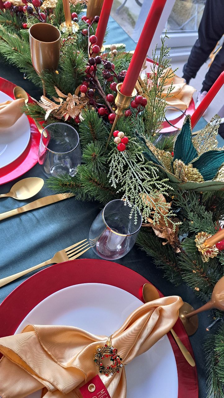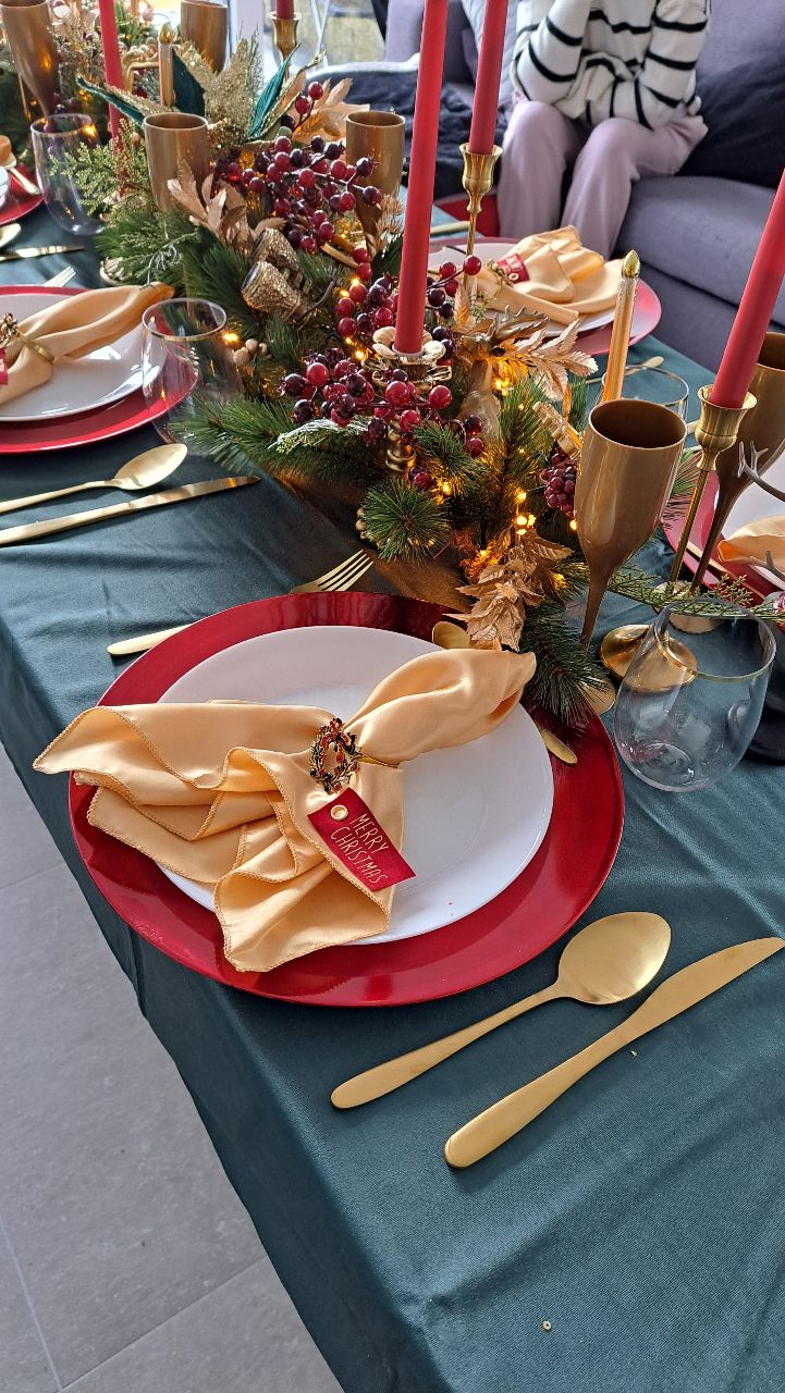 Les assiettes blanches sont posées sur de généreuses sous-assiettes rouges, tandis que les serviettes en satin champagne, délicatement roulées dans des anneaux de couronnes miniatures, murmurent un "Merry Christmas" discret mais charmant. Les couverts dorés et les flûtes nacrées complètent ce décor d’apparat, prêt à accueillir un repas aussi raffiné que chaleureux.